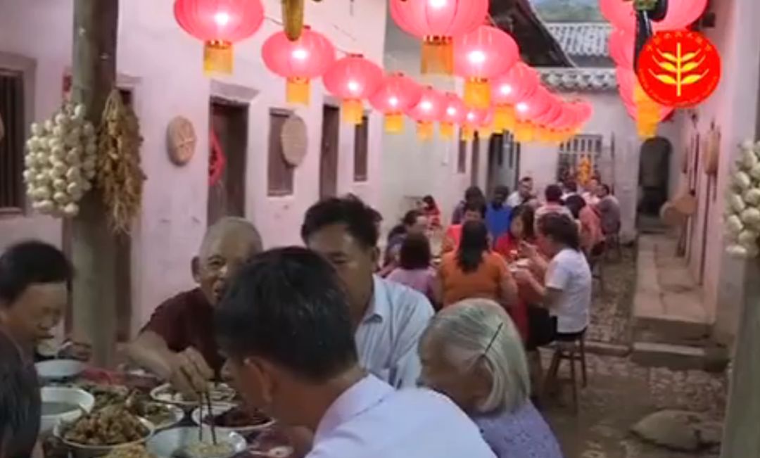 傍晚,苦笋猪肉咸菜、客家酿豆腐、鲜茶叶炖汤、糍粑等特色菜肴摆在桌上,村民们共享丰收长寿宴。